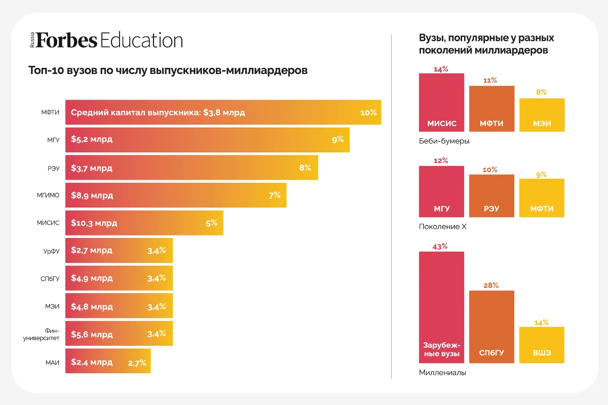 Я нашла информацию, что МГУ и не является главным поставщиком очень богатых людей (возможно, и миллиардеров тоже) - скорее всего МГИМО и ВШЭ? Ну и, возможно целевые - нефть, газ...